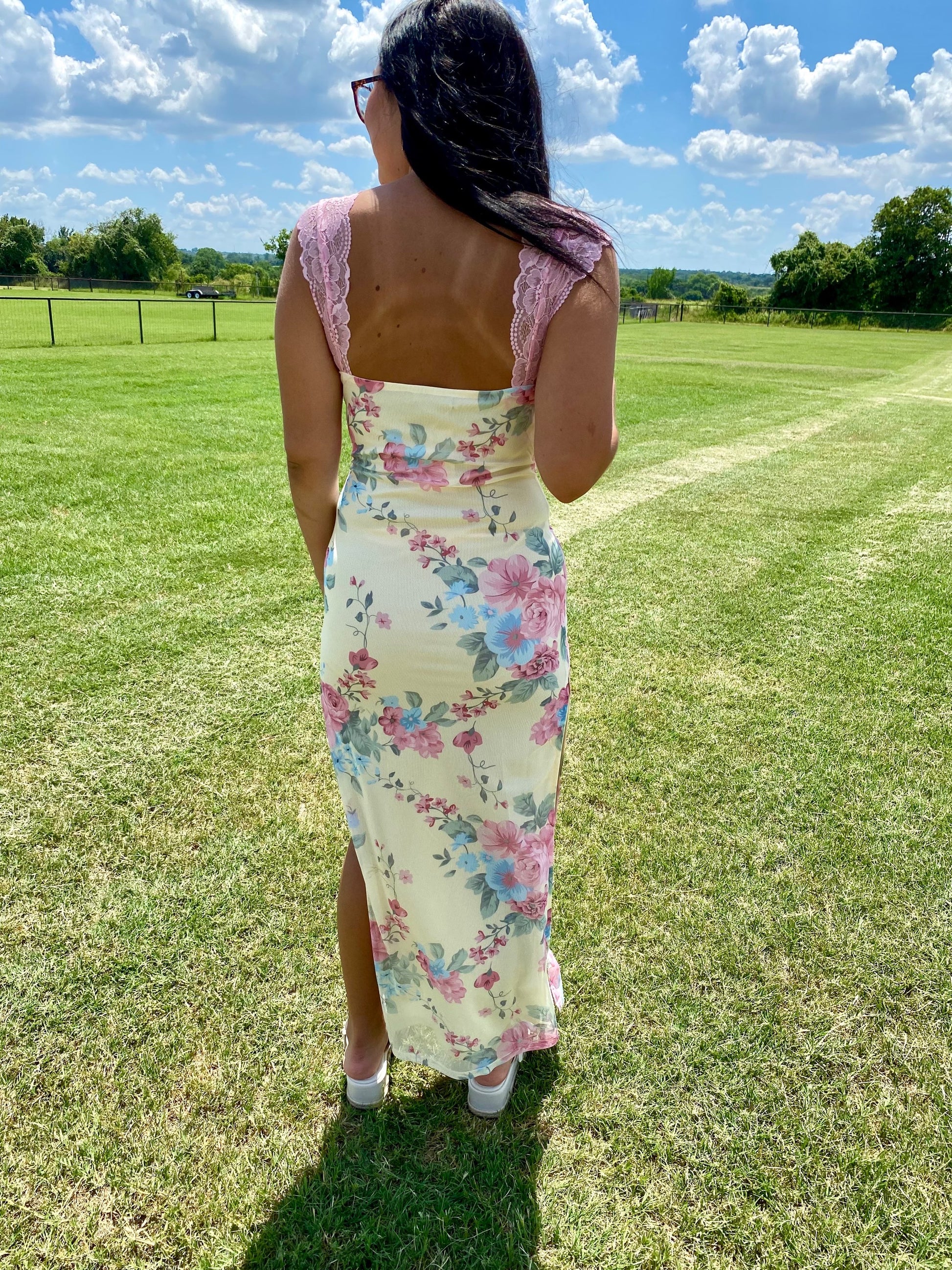 The Daisy Maxi Dress. This stunning floral print dress features delicate lace detailing along the bodice and a flowy maxi dress, perfect for a breezy, bohemian look. Whether you're attending a garden party or a beach wedding, this dress is sure to make a statement. The lightweight fabric is perfect for warm weather. Pair it with strappy sandals and a floppy hat for a effortlessly chic ensemble.